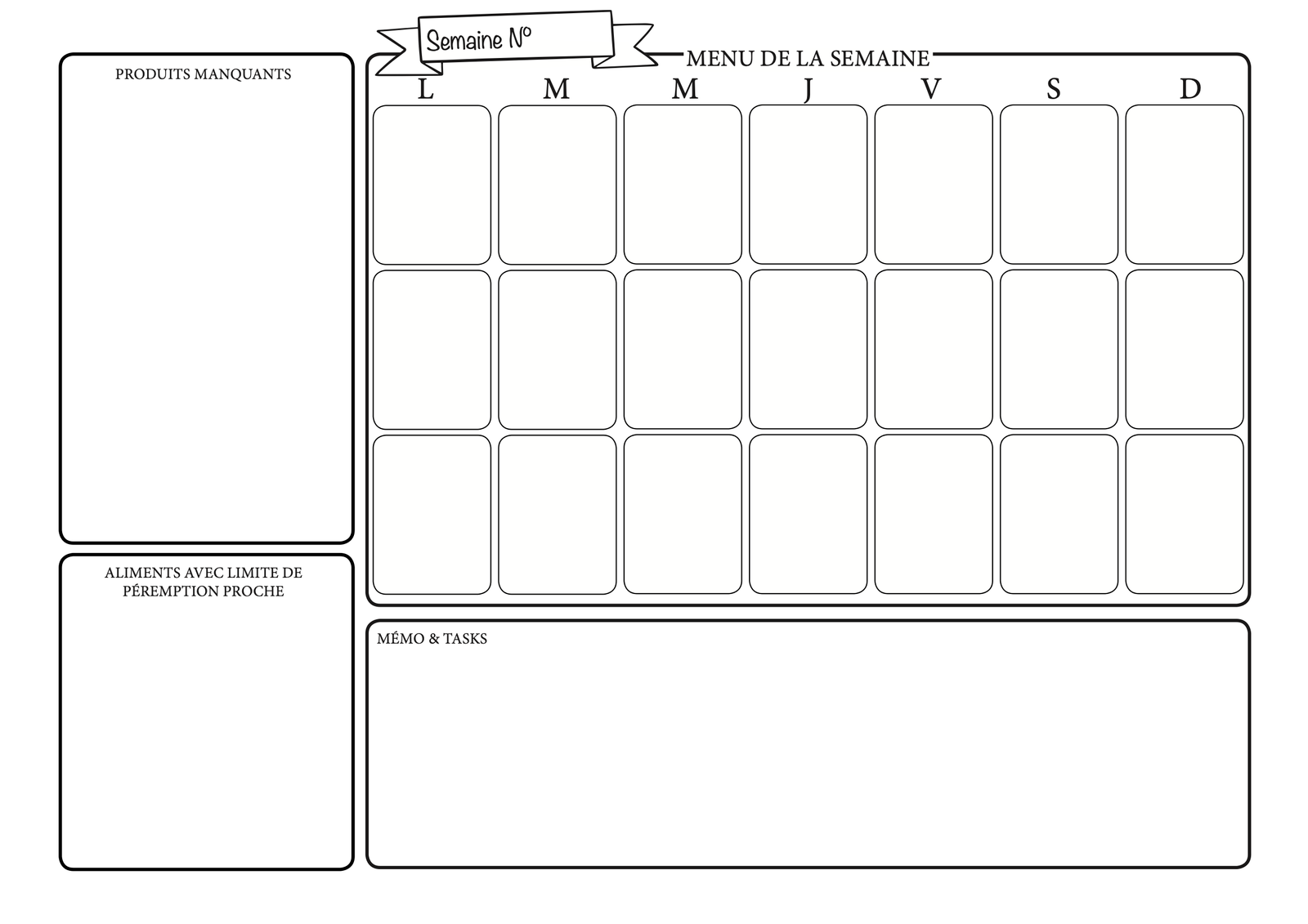 Ce tableau hebdomadaire est un outil simple et pratique conçu pour t’aider à planifier tes repas, suivre les produits à utiliser en priorité, faire tes courses de manière ciblée et noter toutes tes tâches ou mémos en lien avec la cuisine.